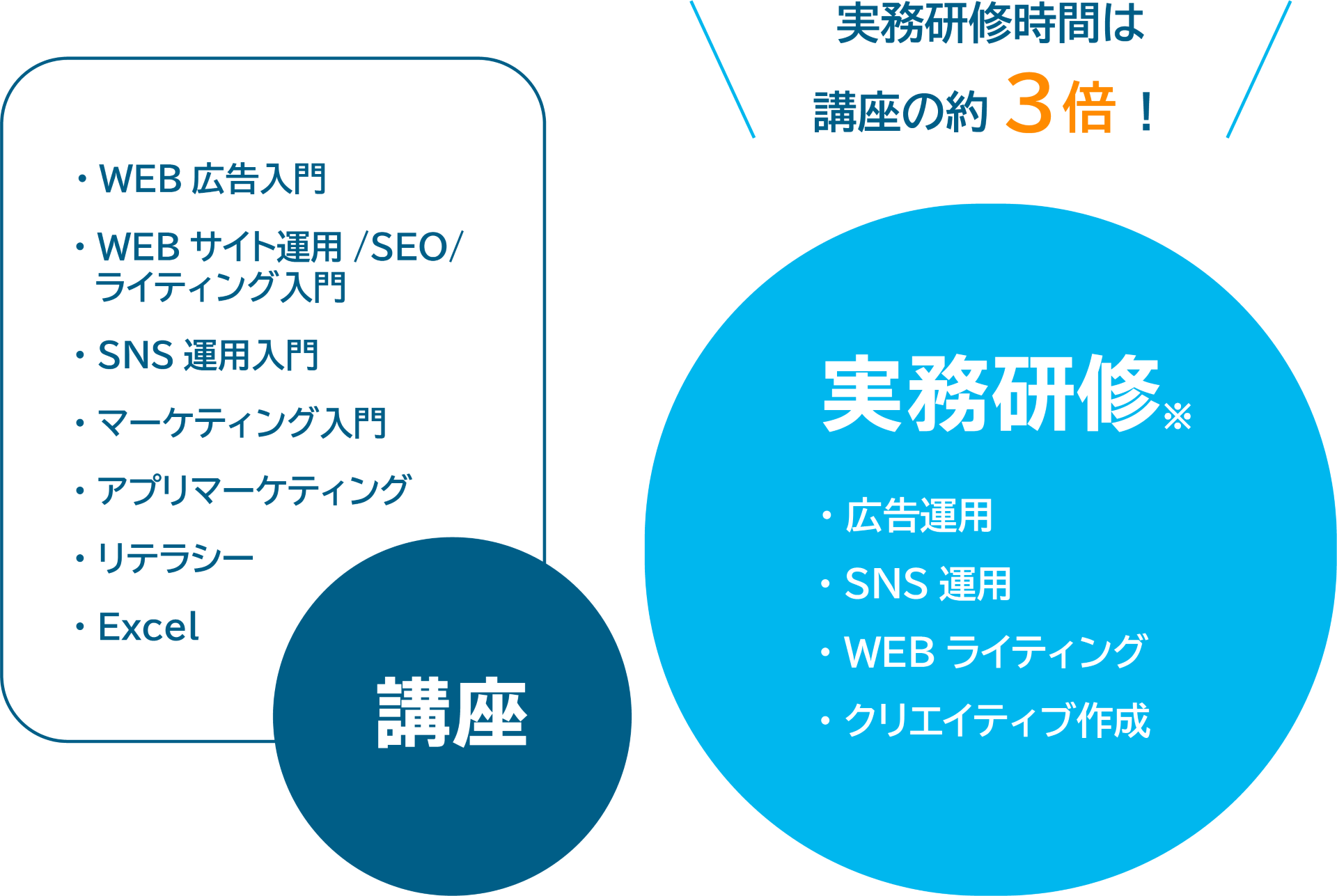 デジタルマーケティング会社監修の実務によるアウトプットを重視した研修を通し、マーケティングの基礎から実践に対応できるスキルを体系的に学べます。