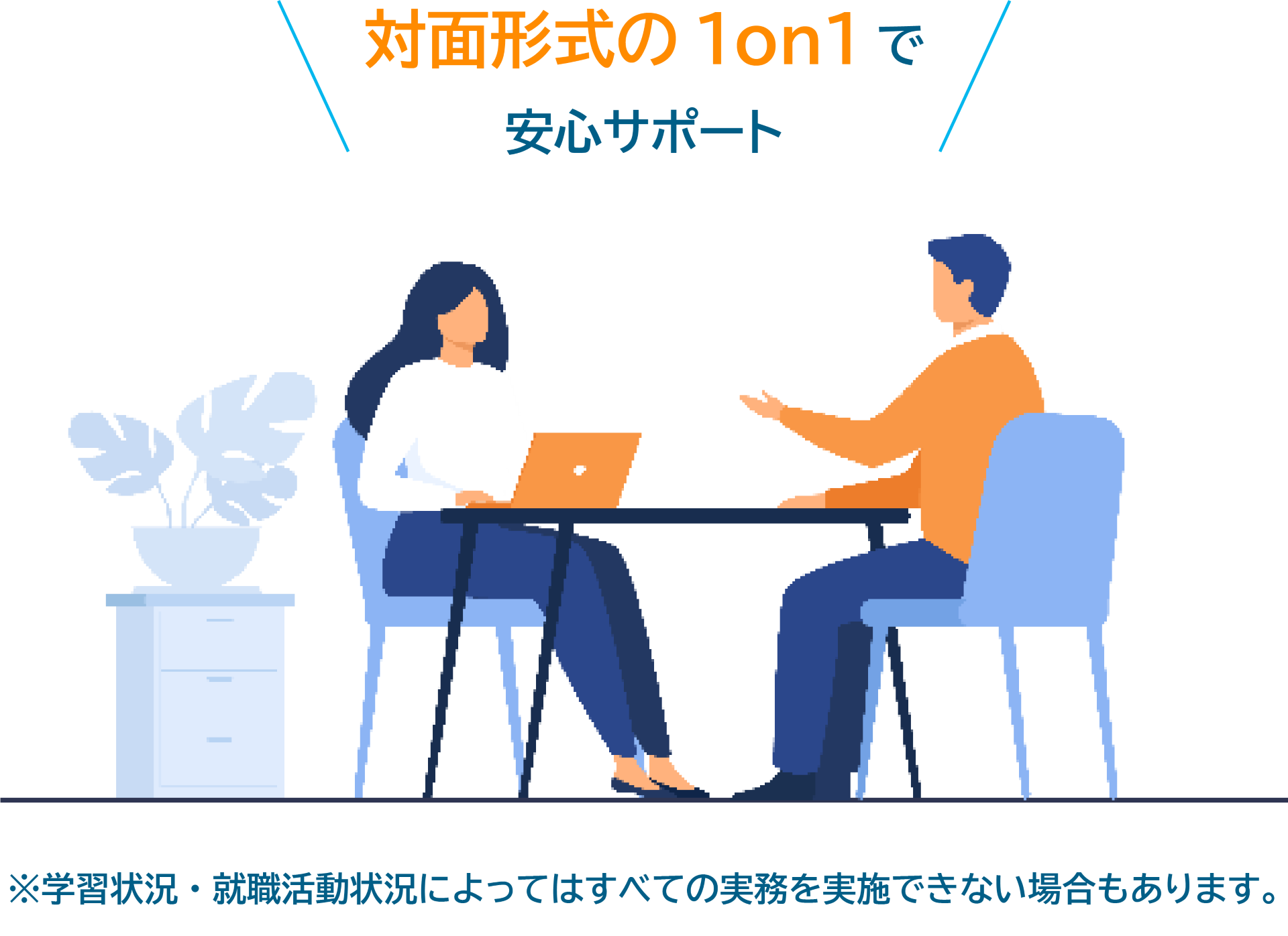 実務研修を圧倒的に重視したカリキュラム。デジタルマーケティング会社のチームメンバーとなり、対面で実務を学ぶ実践型研修を通して自信に繋がるスキルの習得をサポートをします。 また、メンター制度による1on1で、学習やキャリアへの不安を寄り添いながらサポートをします。